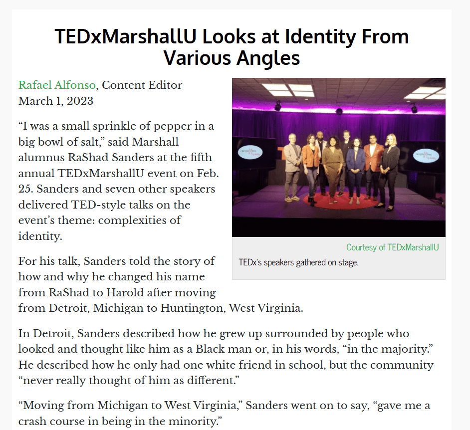 The article above actually caught the eye of the faculty organizer for TEDxMarshallU, and he called me a couple weeks after the event to tell me that my article was the best coverage he’d seen over the past few years. On that same phone call, he strongly encouraged me to apply to be the next Communications Director, a position that eventually allowed me to further exercise my journalistic skills.